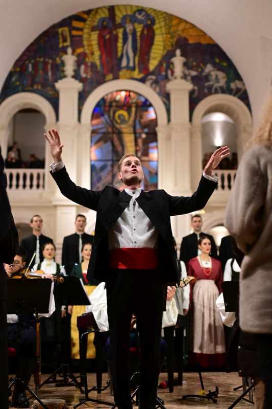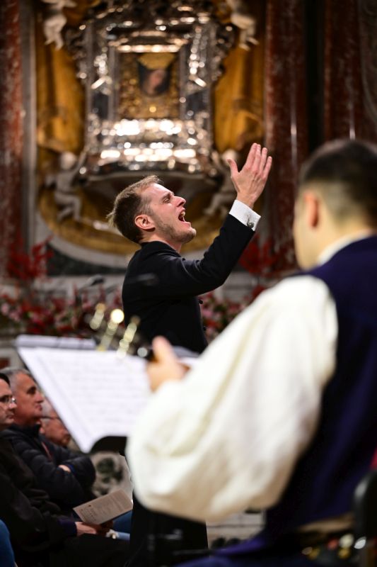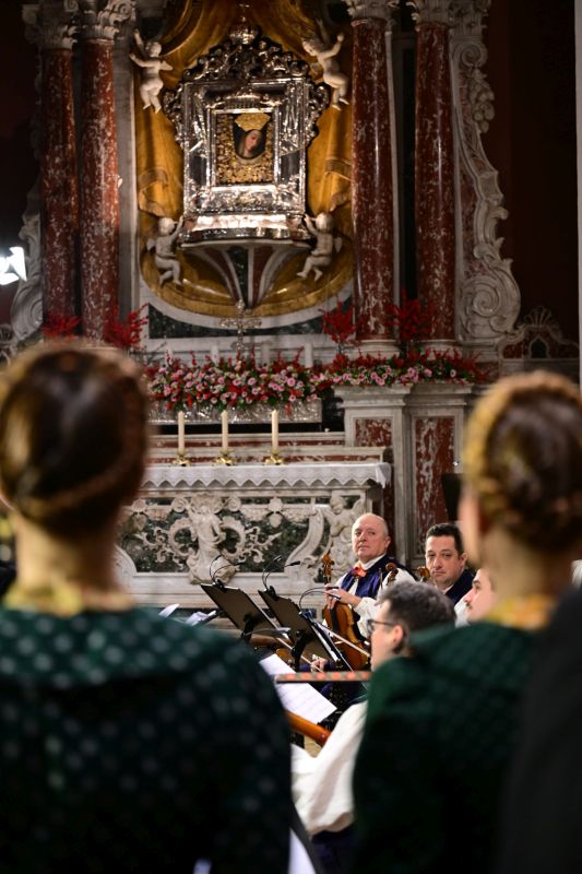 Ansamblom je ravnao dirigent Jurica Petar Petrač, kojemu je po završetku programa fra Antonio Mravak, župnik Župe Gospe Sinjske, prigodno uručio monografiju Zauvijek okrunjena kao uspomenu na ovaj božićni vokalno-instrumentalni program. Po završetku programa, nakon gromoglasnog pljeska publike, koja je potpuno ispunila baziliku i klaustar Samostana, uslijedile su još dvije prigodne izvedbe.